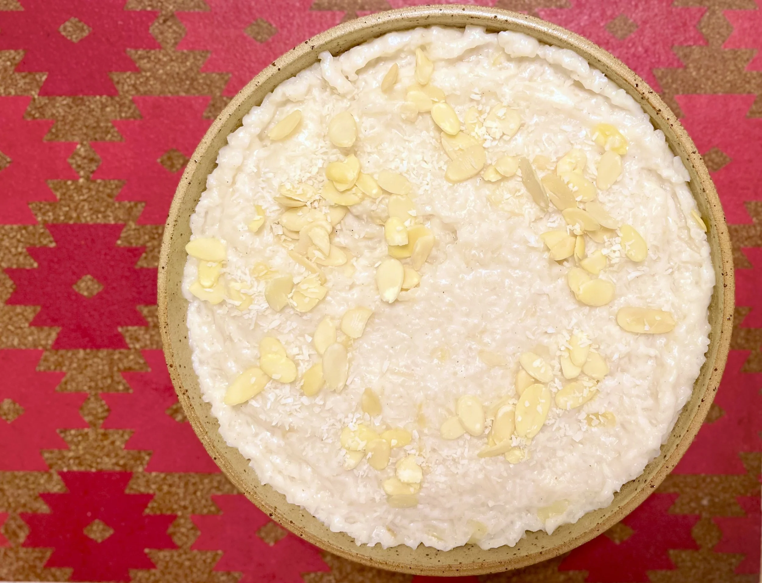5. Pour the kheer into a serving dish, sprinkling flaked almonds and desiccated coconut as a garnish. Enjoy!